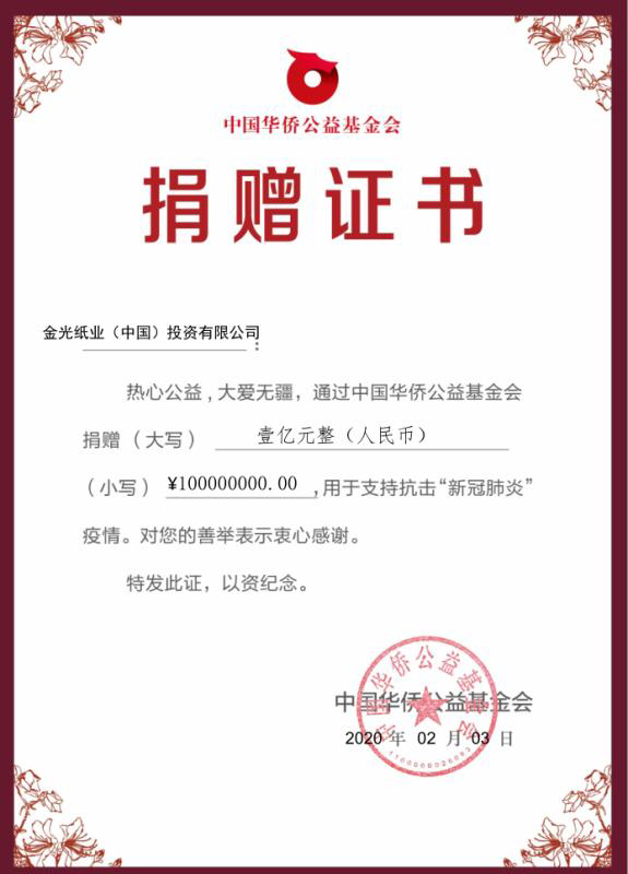 2020年初,新冠疫情在武漢爆發后,金光集團董事長兼總裁黃志源先生于1月26日第一時間通過中國華僑公益基金會捐款 1 億元人民幣和價值 35 萬元的清風衛生濕巾,用于抗擊新冠肺炎疫情。